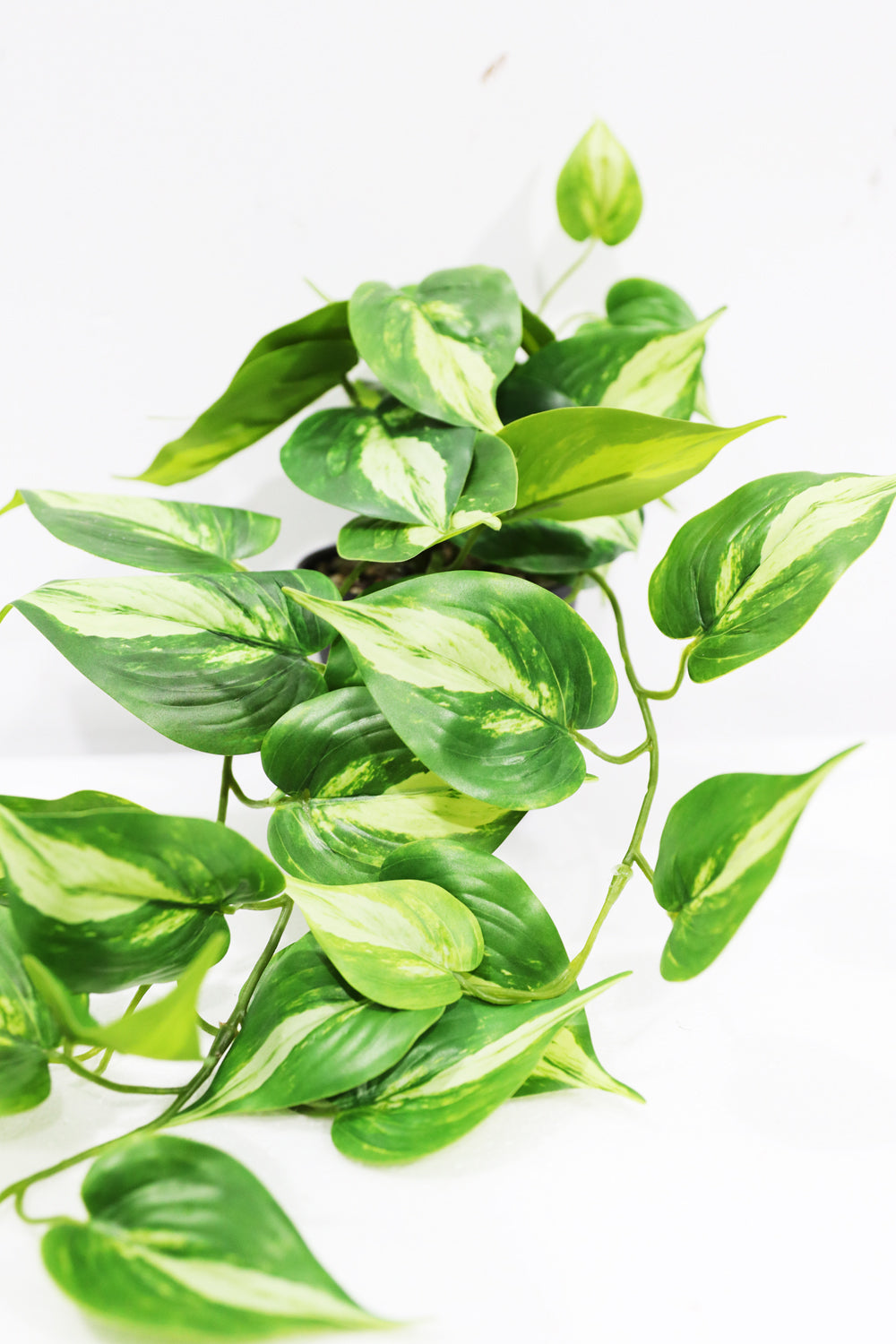A compact artificial Pothos with deep green, arrow-shaped leaves and crisp white veins, perfect for adding a sculptural touch to shelves, desks or side tables.