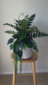 Deep green Alocasia foliage contrasts beautifully with airy ferns and trailing pearls in this full artificial arrangement. A realistic way to add texture, dimension, and greenery to your interiors.